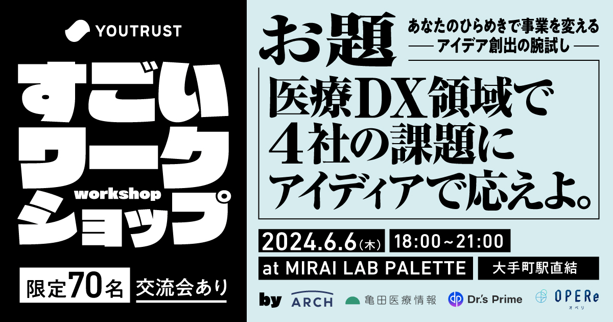 そんな中、今回「すごいワークショップ - 医療DX領域で4社の課題にアイディアで応えよ。」と題して、医療DXを推進するスタートアップ4社と共に企画をご一緒する運びになりました。