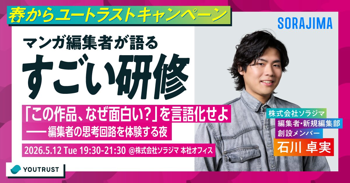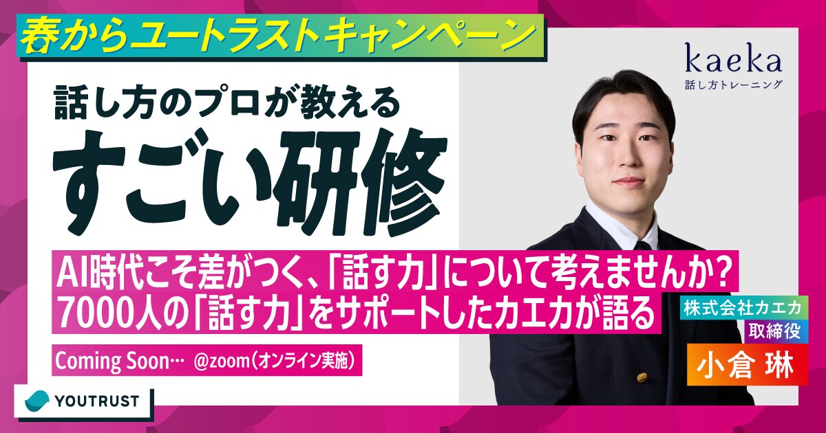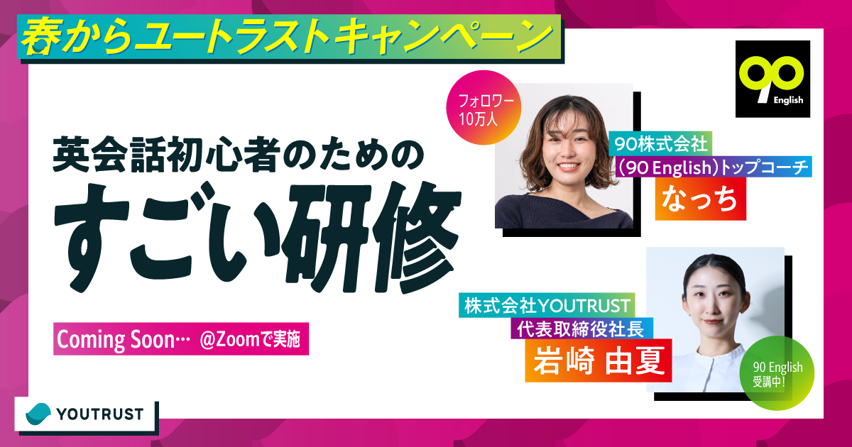 受講生・岩崎由夏(YOUTRUST代表取締役社長)とトップコーチなっちが実践的に教える英語学習術。英語脳の作り方・発音の原理原則・スピーキングトレーニングを体験できるオンラインセミナー。参加無料、2026年5月〜6月開催予定。