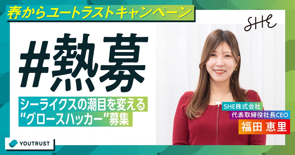 昨年TVCM放映を行ったSHEが、社会を変えるというピュアな野心と、事業を拡大するグロースハックを両立し、お客様と、その先にある社会の変化を作る仲間を募集します。