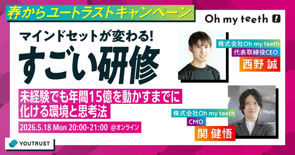 伸び悩みを感じている20代は必見。未経験でも年間15億を動かすまでに化ける環境と思考法を、Oh my teeth CEO 西野誠氏・CMO 関健悟氏が話します。