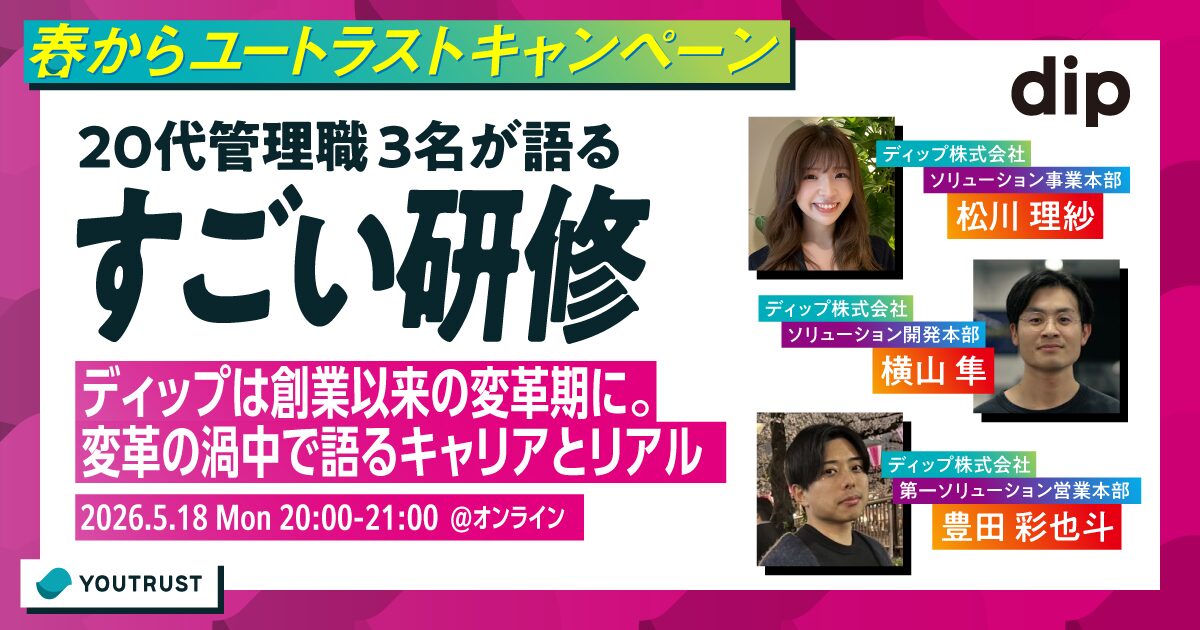 創業以来の変革期へ突入しているディップが変革の渦中を語るセミナーです。20代管理職(営業、企画、開発)の3名がキャリアとリアルをパネルディスカッション形式で語ります。