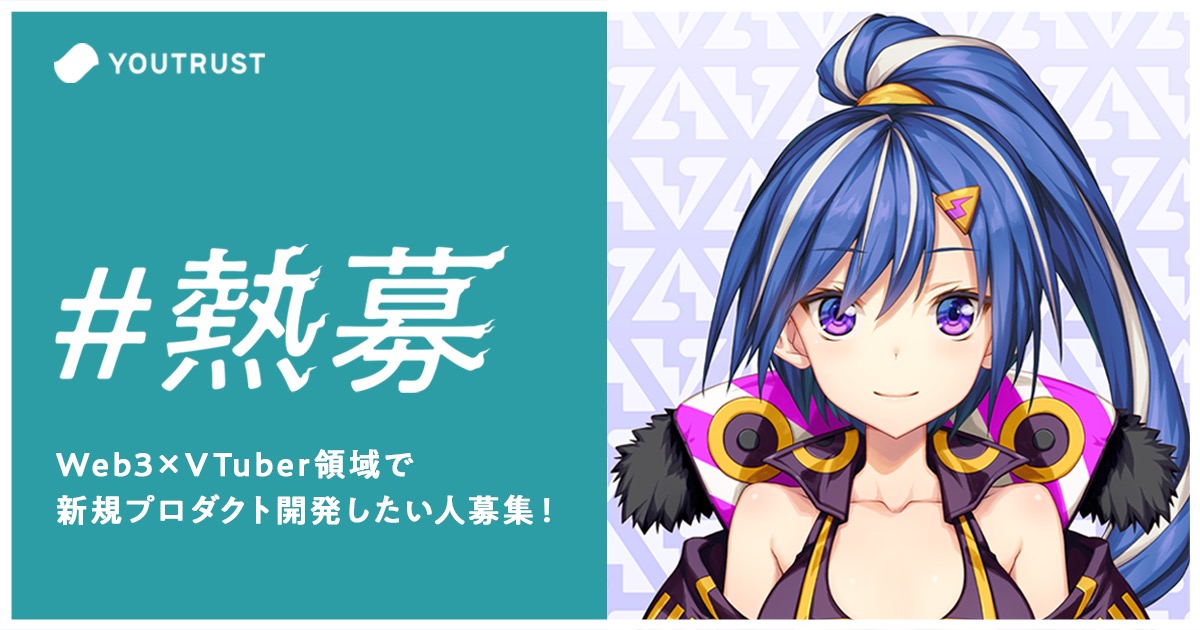 今回YOUTRUSTさんの「熱募」で、Web3×VTuberの領域で、コミュニティとともにメタバースのスターを作るためのインフラを共に作りたい仲間を募集します!